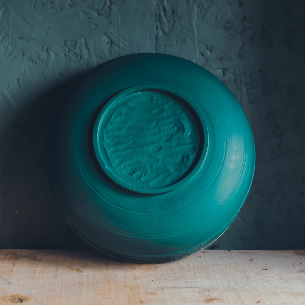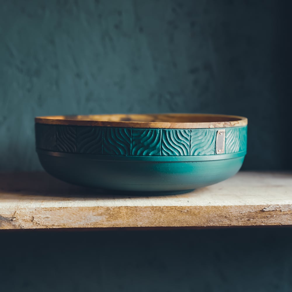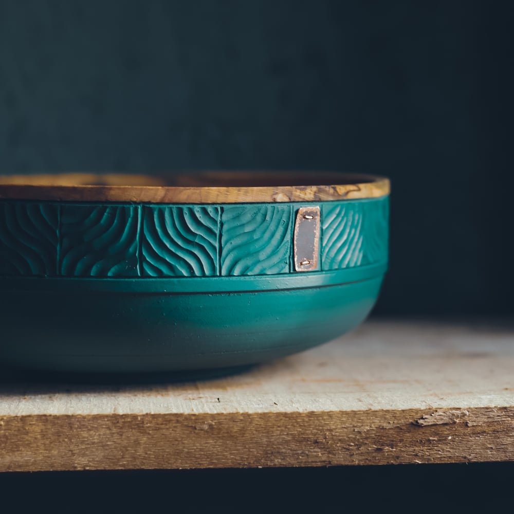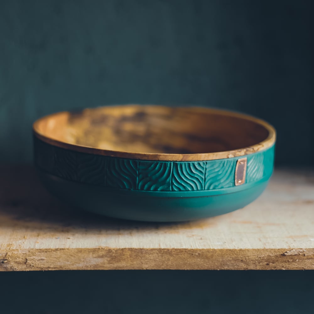 The blue green finish settles into these carved channels, catching light much like wet stone on the moor. Set into the rim is a copper plate patinated with sea water, its changes of colour suggesting both the metal sought by those early miners and the long reach of the coast that shaped their work.