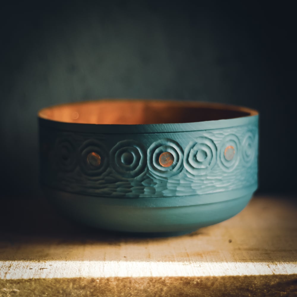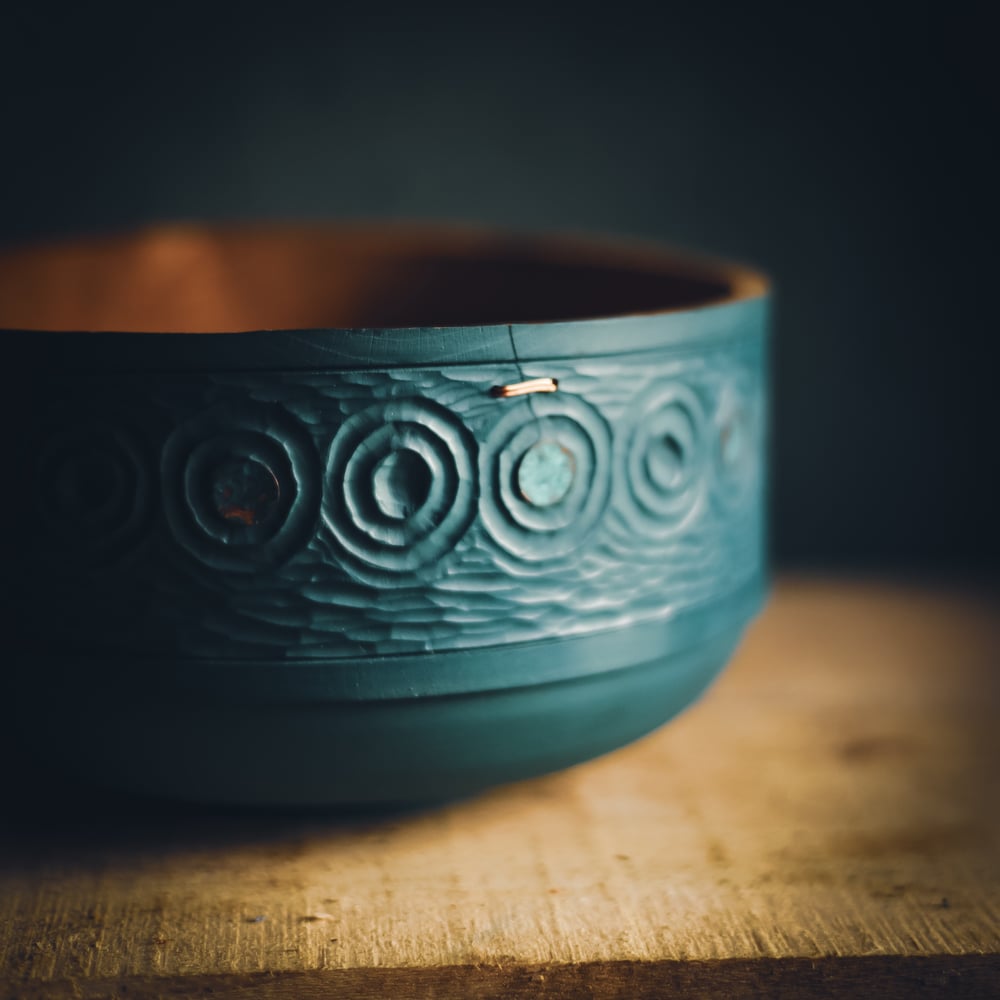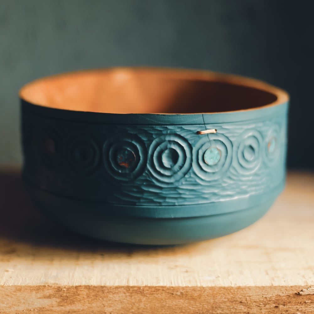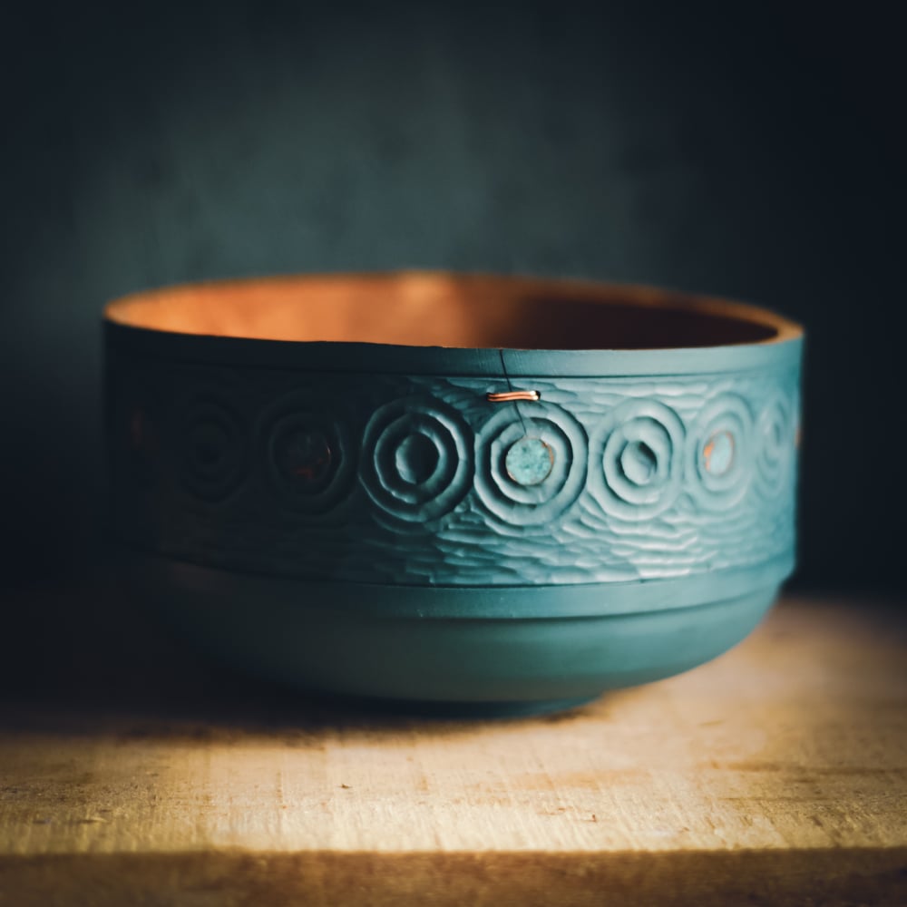 Set into the carved band are ten patinated copper discs. Their colour shifts hold the greens and browns of metal touched by salt water, like fragments uncovered in old stopes or brought to light after long quiet years. A single copper stitch sits across a natural line in the rim, a small but deliberate repair that mirrors the ways miners once braced and supported the ground around them.