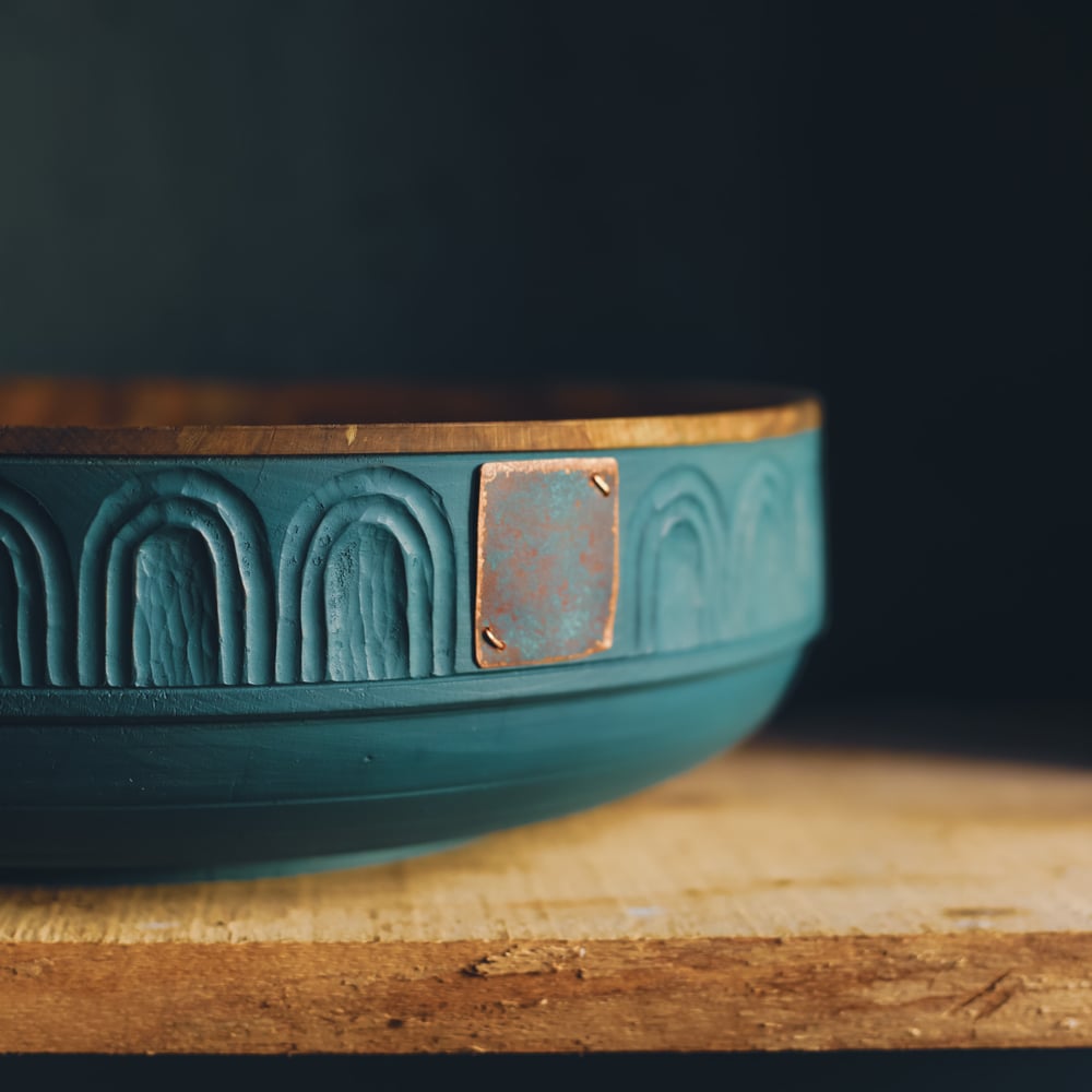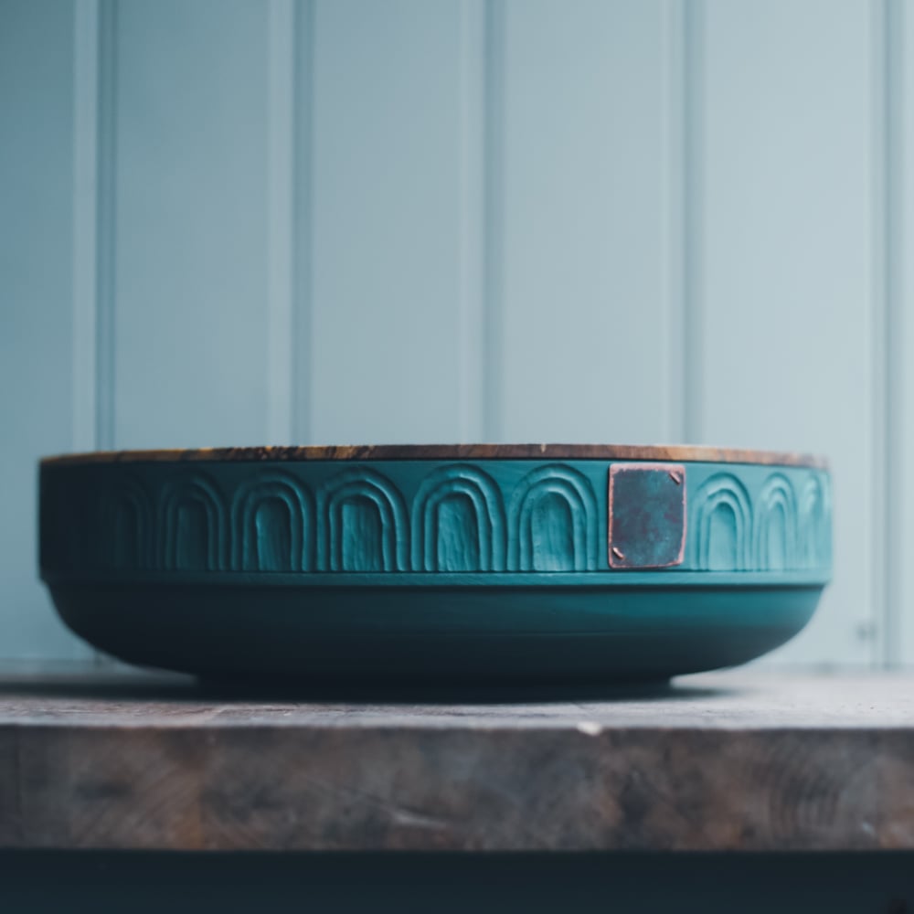 The blue green finish gathers in the recessed carving and lifts along the outer edges, giving the line of stones the depth of silhouettes seen against shifting sky. Set into the rim is a copper plate patinated with sea water, its surface shaped by salt and time. It suggests the weathered fragments sometimes found near sacred sites, pieces left by hands whose histories are now part of the land.