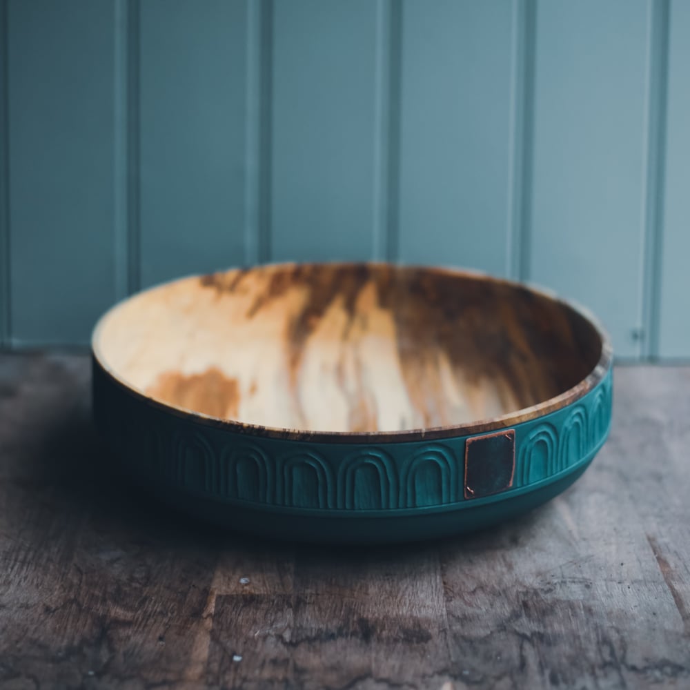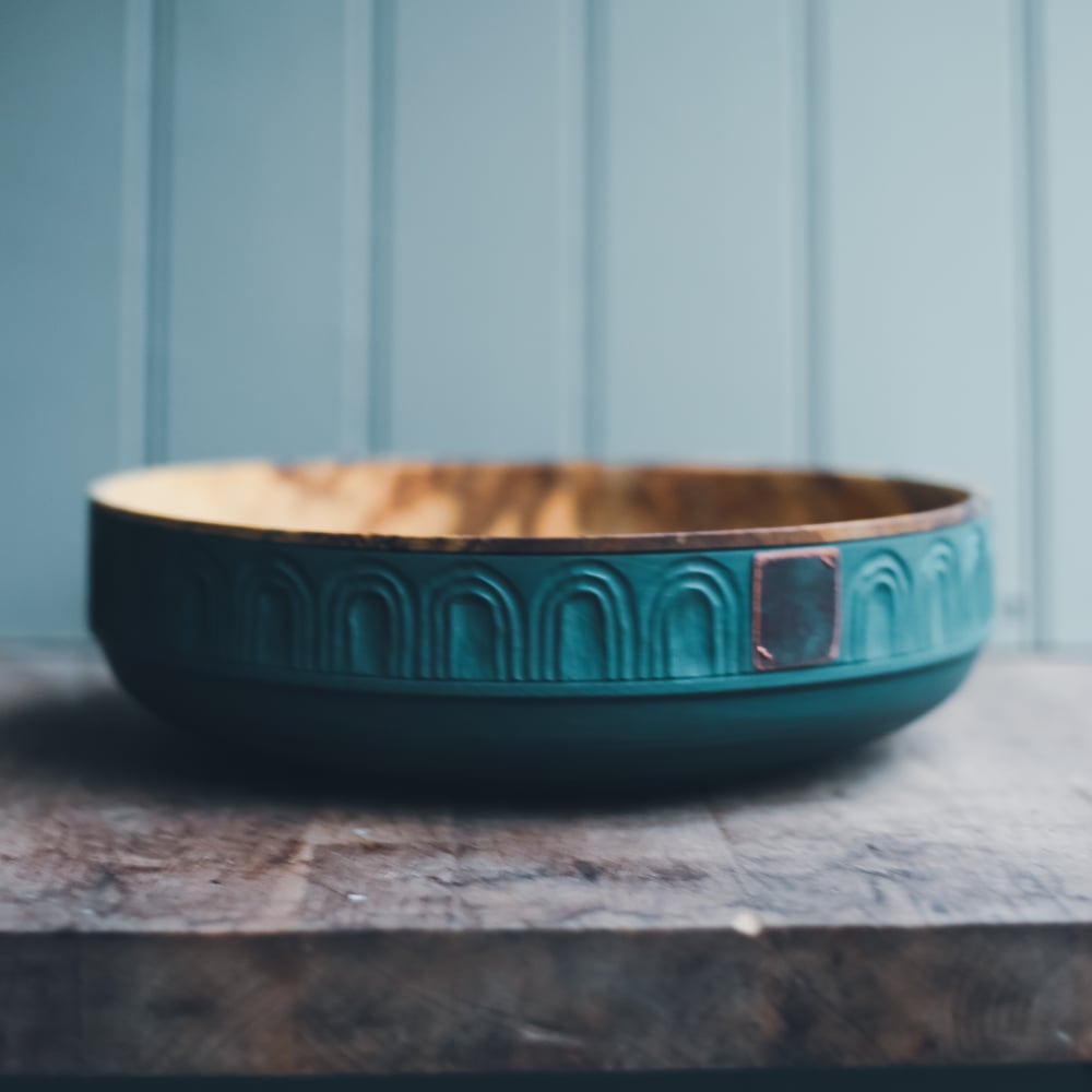 This bowl stands as the centrepiece of the collection. The carved rim follows the rising forms of standing stones, each arching shape echoing the markers set into Cornwall’s ancient ground. The pattern carries the sense of portals to earlier days, the openings found among circles, rows and solitary uprights scattered across the moors. These repeated forms hold a slow rhythm, as though each one keeps a fragment of the stories bound into those places.