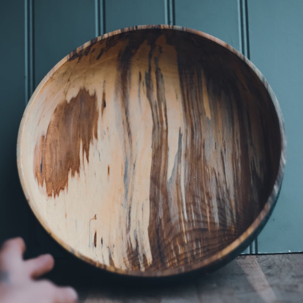 Inside, the beech shows its full sweep of grain, warm and open in contrast to the sculpted exterior. At thirty five centimetres, the vessel carries a strong presence, its wide form giving space for the standing stone motif to run its full circumference. The piece holds a connection to Cornwall’s ancient places, to the thresholds and gatherings that shaped its earliest landscapes.