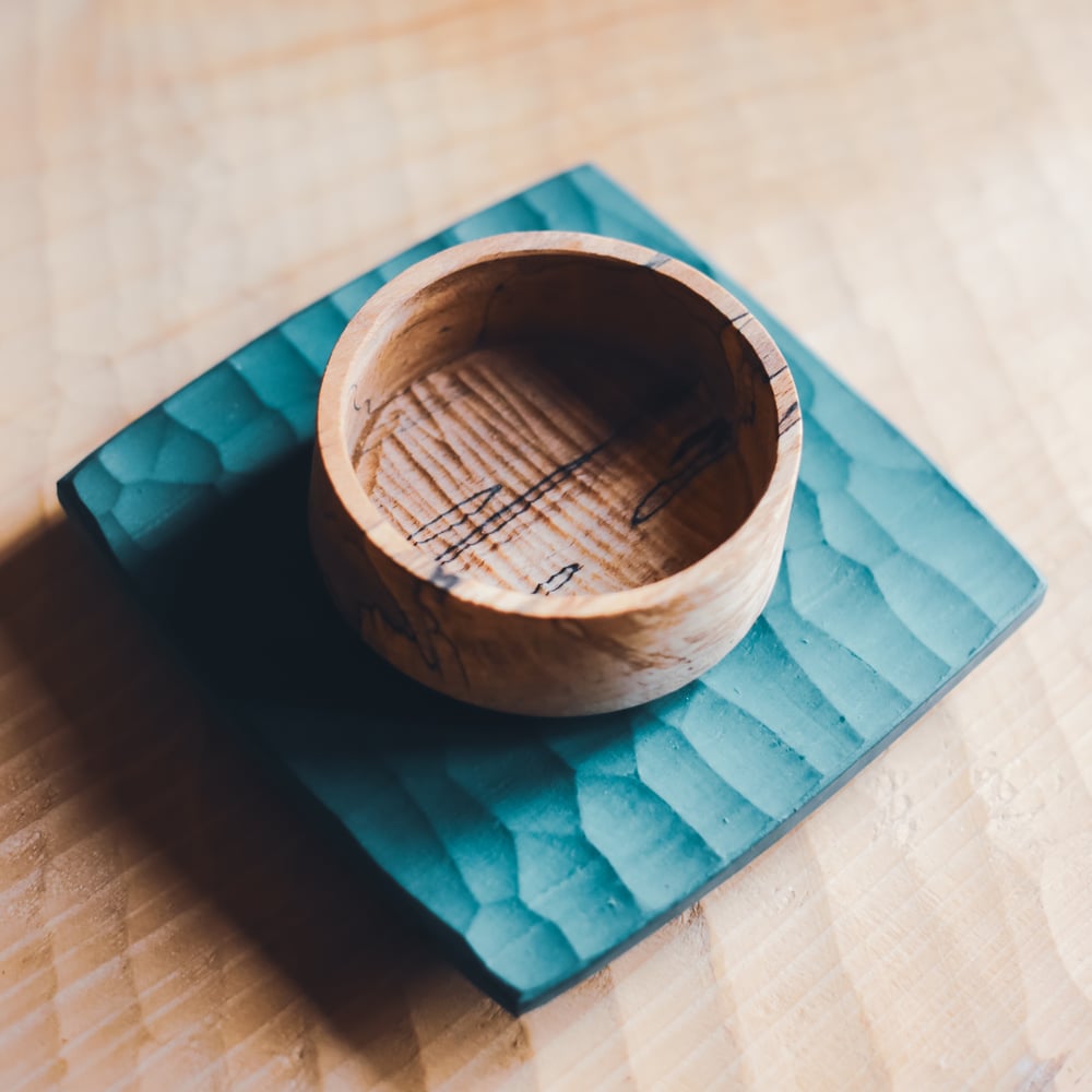 This compact set brings the quiet beauty of Cornwall’s coastlines into intimate focus. The tray, with its rippled carving and deep blue-green finish, reflects the gentle undulations of shallow waters lapping against the shores of secluded coves. The spalted bowl, sitting proudly at its center, showcases the wood’s natural character—each mark and grain a testament to its journey through time.
