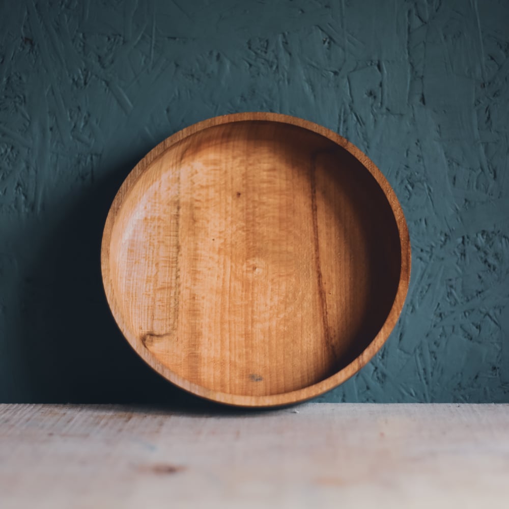 The rim and interior are left in natural beech, showing the warm tones of the wood. A coat of food grade hemp oil gives a smooth finish that is suited to regular use. The bowl keeps to a modest design with a shallow rise at the sides and a balanced curve, making it a practical companion for daily meals while holding the quiet character of its name.
