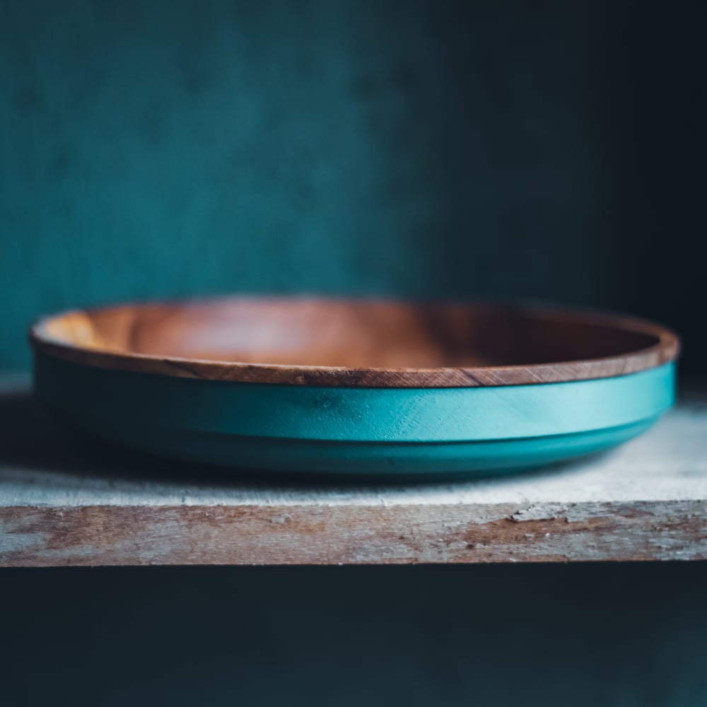 A coat of food grade hemp oil brings the surface to a gentle sheen and adds to the smooth feel in the hand. At twenty five centimetres across, the plate has a low rise at the sides which makes it practical for serving or everyday eating. The combination of warm beech inside and the cool blue exterior gives the piece a simple coastal character.