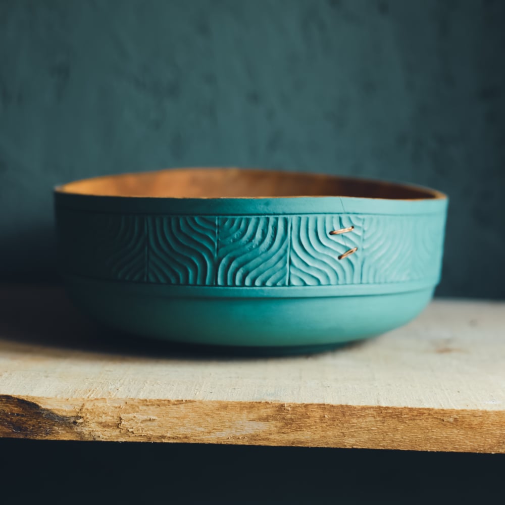 A bold, sculptural bowl turned from green beech, then painted in a vibrant coastal blue using traditional milk paint. The outer wall is carved with large, undulating waves — strong, sweeping textures that echo breakers rolling to shore or the shifting skin of open water.